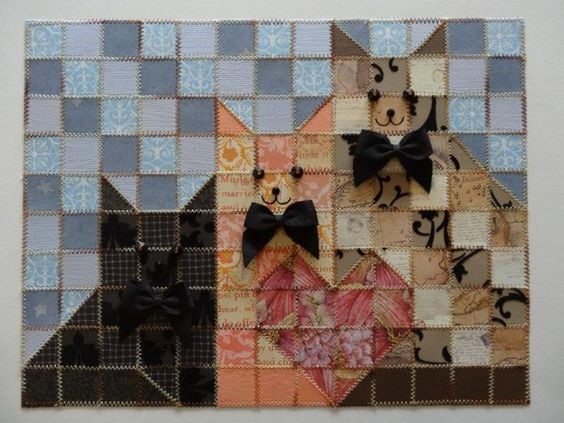 And my inspiration pictures from Pinterest. These were original kits from McCalls done in scrapbook type paper patchwork. Squares were cut and then zigzagged together on top of card stock. Squares were 1" in size when cut. I'll be cutting 4.5" squares from my scraps. Am making the one with two cats first. Dark pinks for the cat on the right, medium pinks for the one on the left. Haven't decided though if I'm going to put the heart in or not. Or if I do, what color fabric I'm going to use for it. Will applique the faces once it is all together. What do you think about the heart - Should I add it? If so, what color would you make it with the pinks shown below?